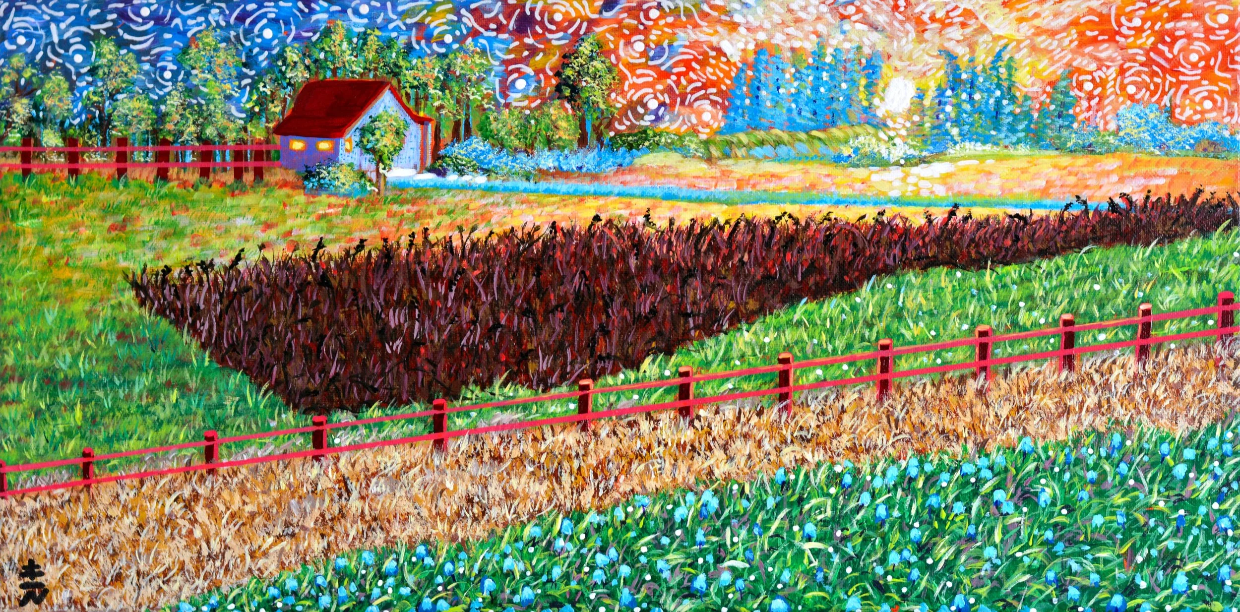 Harvest in Snohomish" captures a quiet, colorful moment along the Centennial Trail. A cozy farmhouse, brushed in warm tones, rests among fields that ripple with reds, greens, and golden yellows, like a quilt stitched by the season. Between the wild and lush green grass, a wheat field stands nearly ready for harvest, something I noticed while walking past the bold red fence. The farm draws your eye across the landscape, inviting you to wander through the scene. Above it all, a swirling sky reminds us that nature has its own rhythm and poetry. This piece brings the charm of country life to any space, rich with warmth, story, and color.